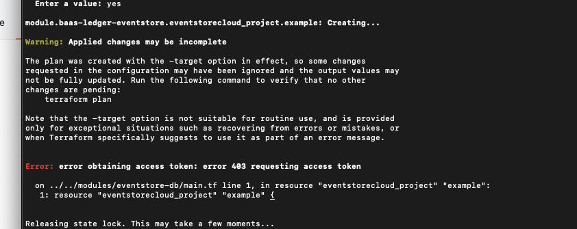 Hey Folks. I’m curious if anyone can help me with a terraform issue I’m having with the eventstorecloud provider. Essentially, I’ve gone through the steps highlighted here: https://github.com/EventStore/esc to create a token with the command line tool, esc. With that token, I input it in my terraform provider code, using the token id of my auhentication token: